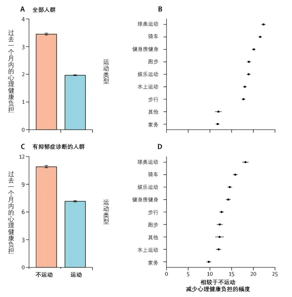 一项涉及超过120万的超大规模调查研究发现,与不运动的人相比,经常运动的人报告的每月心理健康不佳天数平均减少1.49天,降幅达到43.2%,尤其是对于那些既往有抑郁症诊断的人来说效果更好,运动能让他们每个月心理健康不佳的天数减少3.75天,降幅也达到了34.5%。而且,在所有的运动类型中,球类运动起到的效果是最好的,能够减少大约22.3%的心理负担,而羽毛球运动就是其中之一。