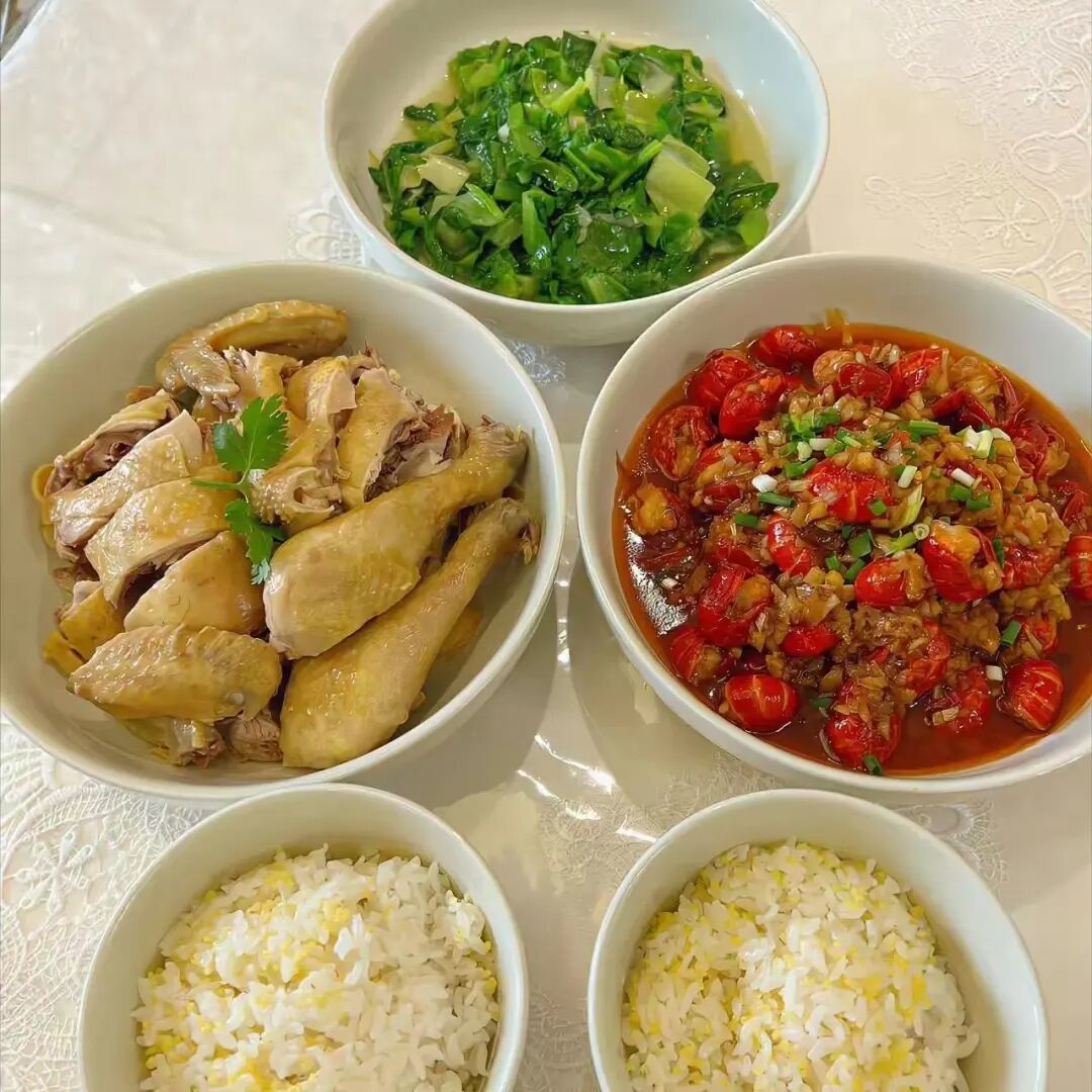 周一晚餐:白斩鸡+香辣小龙虾尾+炒油麦菜。
