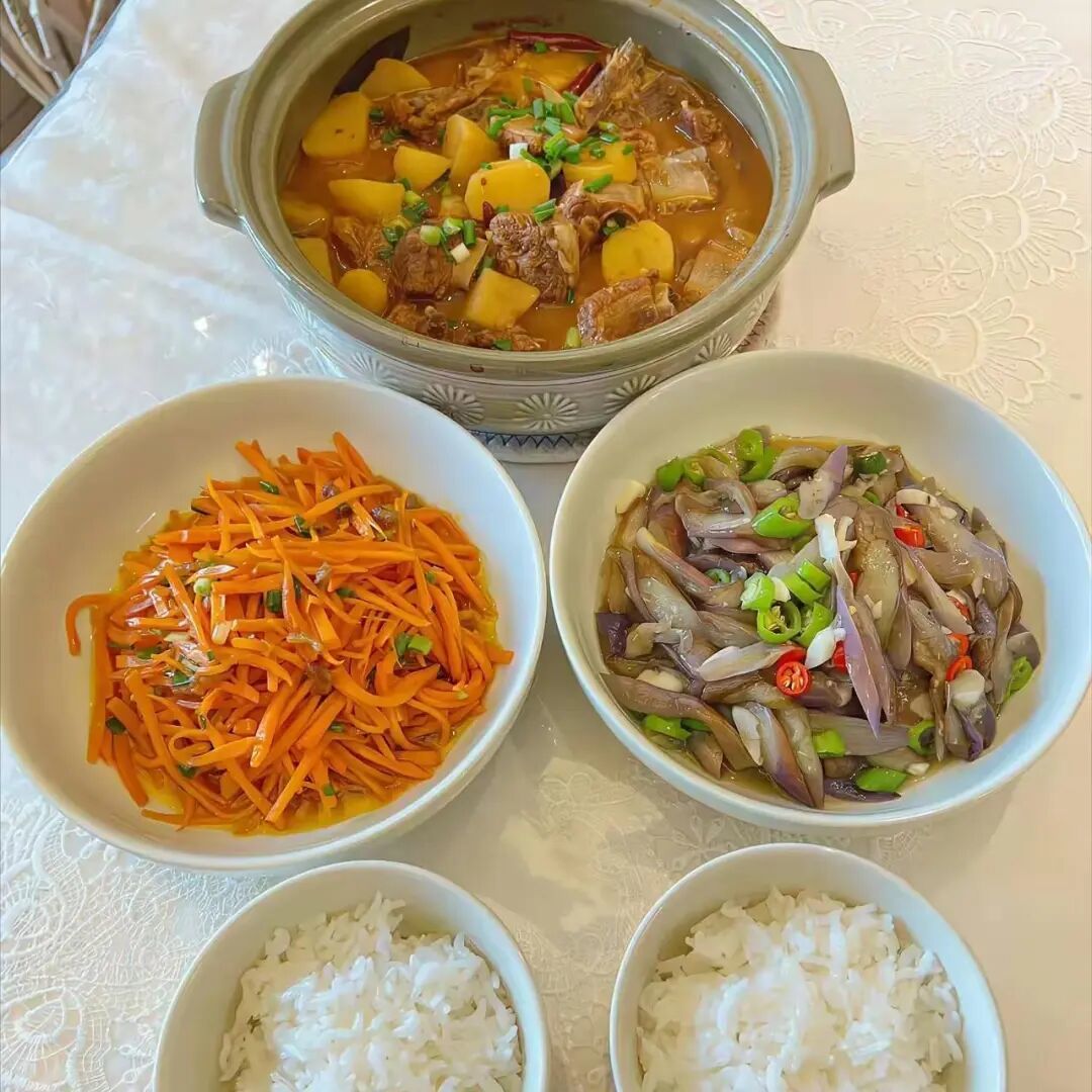 周四晚餐:土豆焖排骨+炒茄子片+炒胡萝卜丝。