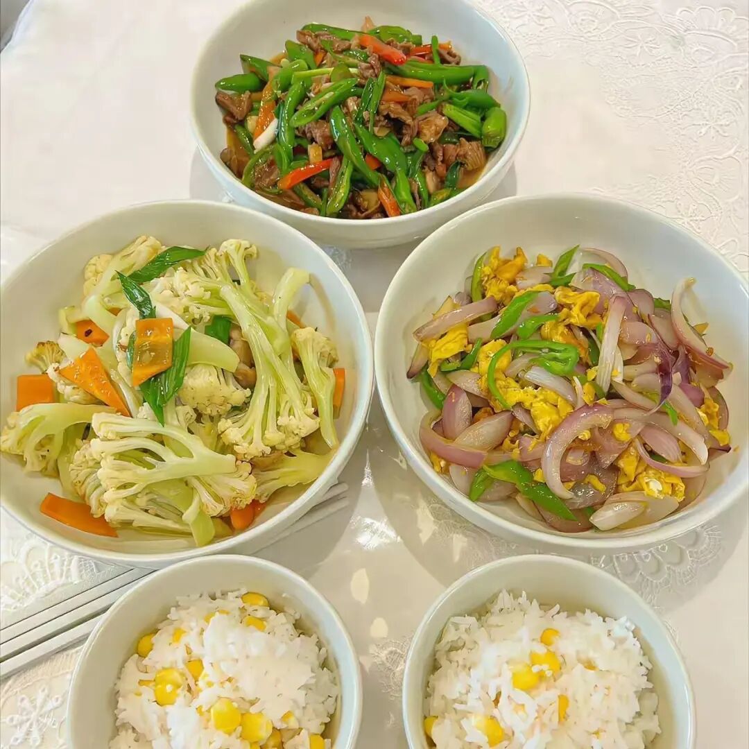 还有洋葱炒蛋,这个菜女儿也爱吃,将洋葱切丝和鸡蛋一起爆炒,吃起来香甜美味,花菜炒肉也是一道比较清爽的菜肴,对于母女二人足够吃了。